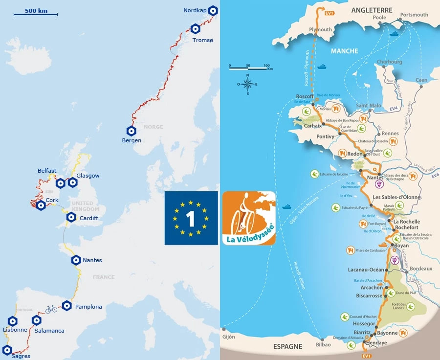 L’EuroVelo 1 est généralement parcourue du nord au sud, mais elle reste réalisable dans les deux sens. Son tracé longe principalement la façade atlantique et permet de découvrir une mosaïque de cultures, de climats et de reliefs.
