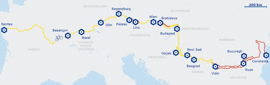 Le tracé commence à Saint-Brévin-les-Pins, suit la Loire à vélo, emprunte le canal du Centre, traverse la Bourgogne à vélo, longe le Doubs puis le Rhin, avant de filer à travers l’Europe centrale en longeant le Danube EuroVelo 6 jusqu’à son embouchure