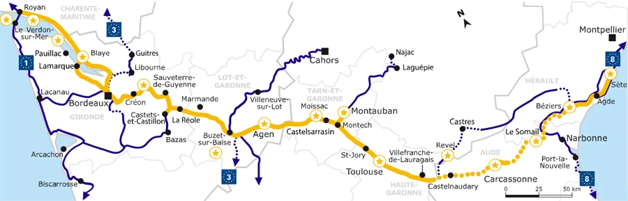 - La Scandibérique (EuroVelo 3) : elle croise l’itinéraire entre Bordeaux et les pistes cyclables de Toulouse. Vous pouvez ainsi remonter vers Paris ou descendre jusqu’en Espagne.