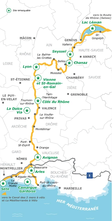 - EuroVelo 17: this is the complete route of the ViaRhôna, connecting the source of the Rhône in Switzerland to the Mediterranean, passing through France.