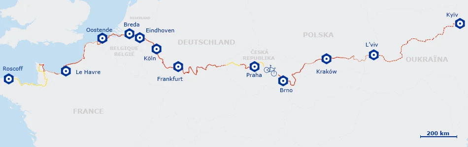 The route begins in Roscoff, on the Breton coast, then follows the English Channel via Saint-Malo, Cherbourg, the cliffs of Étretat, and Dieppe to Dunkirk. It then crosses Belgium, passing through the city of Bruges and the Netherlands, and then enters Germany via Frankfurt. The route continues east through the Czech Republic, passing through Prague, Poland via Krakow, and Kyiv in Ukraine.