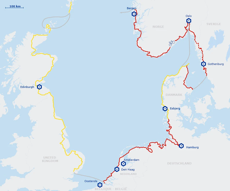 The North Sea Cycle Route has been largely completed, but the layout varies depending on the country: