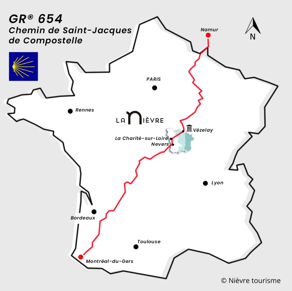 The main stages of the GR® 654 : it begins in Namur, Belgium, then crosses France via La Charité-sur-Loire, Nevers, Vézelay (the famous “eternal hill”), Bourges, Limoges (with its Saint-Martial Abbey), Périgueux, Mont-de-Marsan, and finally Montréal-du-Gers. At each stop, you’ll discover varied landscapes and experience unique experiences, immersing you in the spirit of the pilgrims.